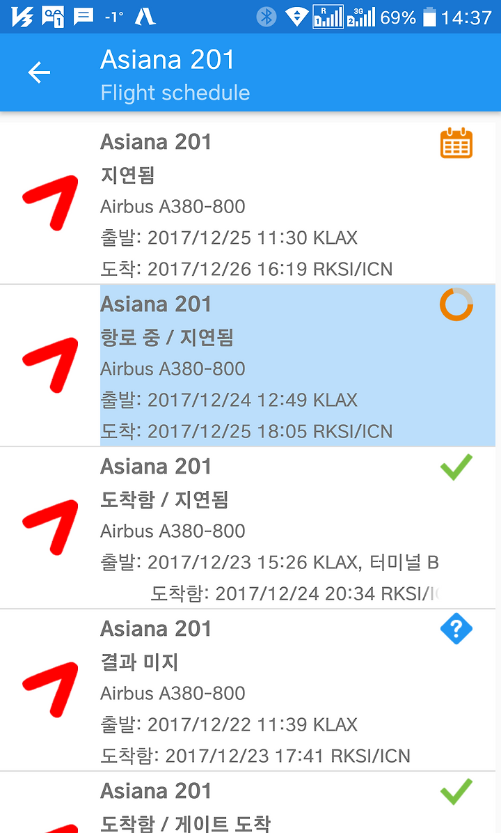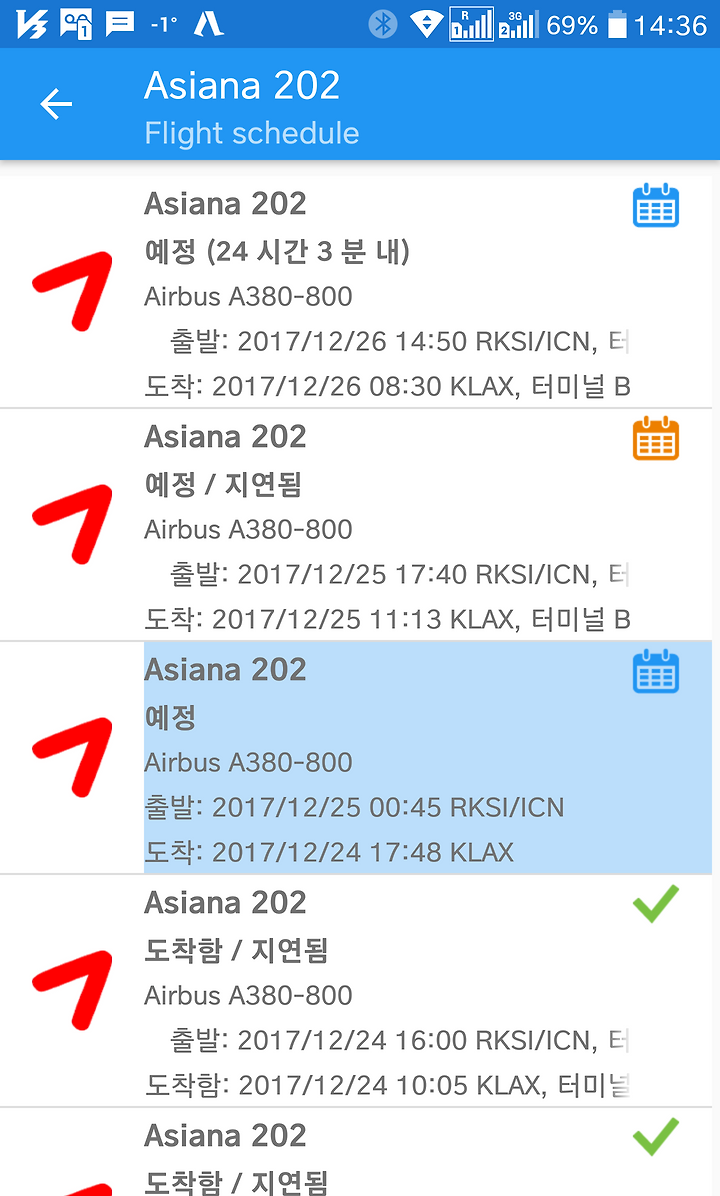 먼저 OZ202 인천->엘에이 구간이다. 이게 늦게 떠나면 엘에이에서 인천으로 와서 인천에서 아시아존으로 환승되는 시간이 늦어진다. 저녁에 싱가포르 호치민 하노이 방콕이 지연출발 하는 원흉이 바로 OZ202의 지연, 연이은 OZ201의 지연이다.