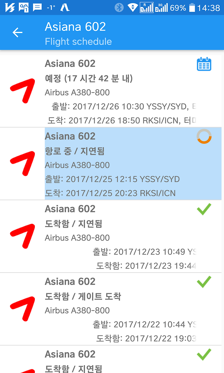 그러면 나리타에서 인천 오는 비행기, 시드니에서 인천 오는 비행기 출도착 시간을 보자.