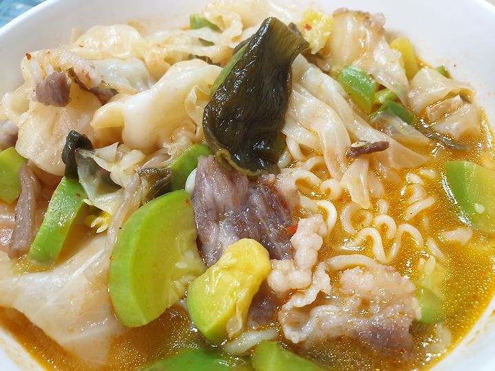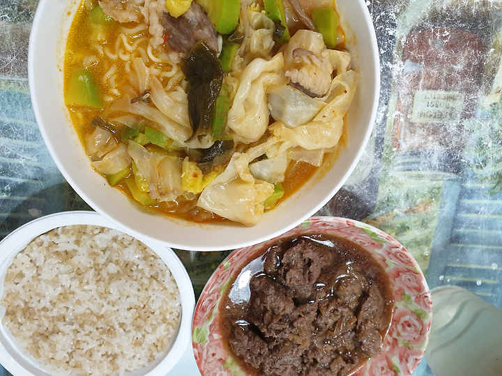 고기 좀 넣고 CJ 곰탕 육개장 넣어 팔팔 끓이고 냉동에 꼬불쳐든 마지막 불고기..랑 한끼를 어케 해먹었다